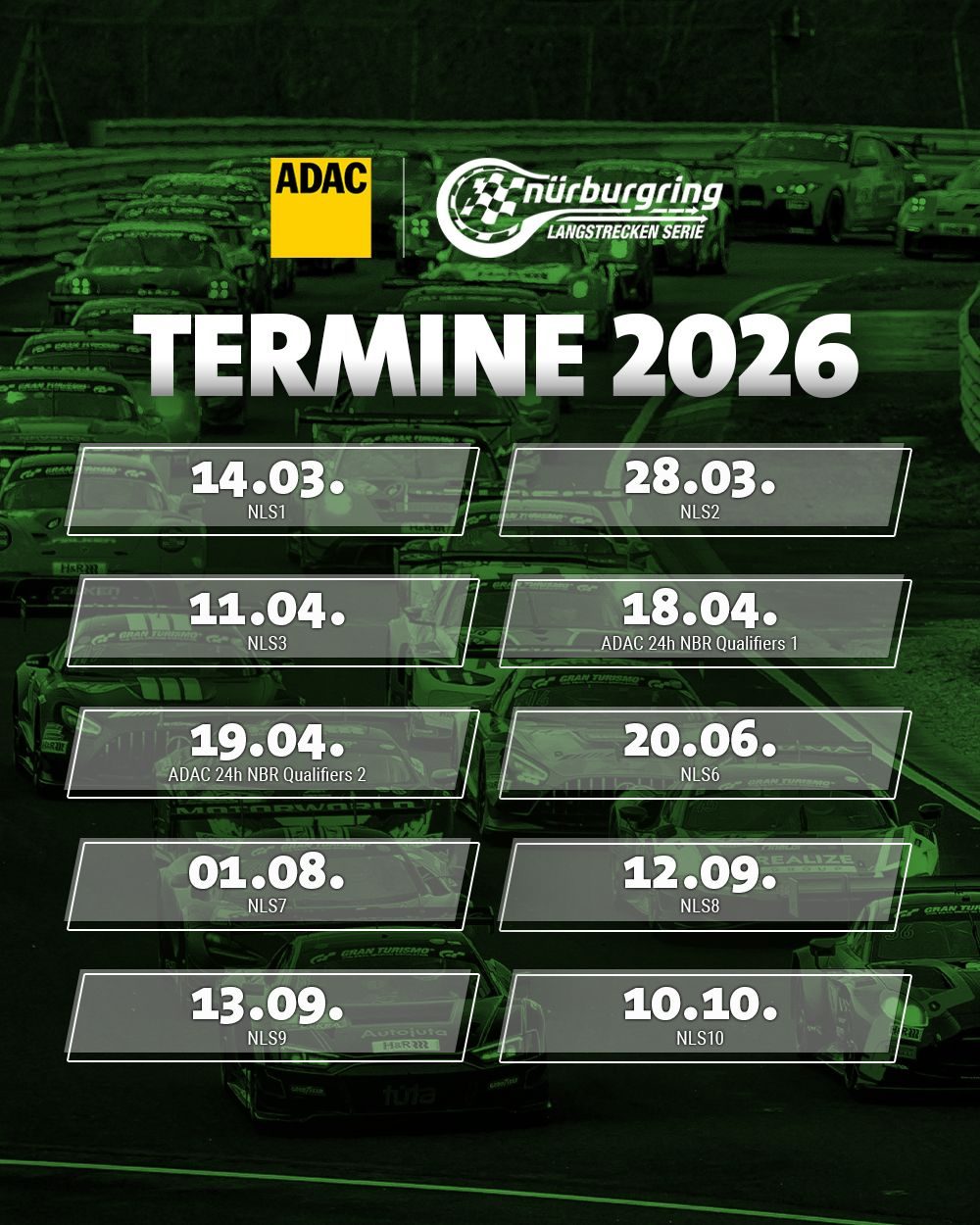 10 Rennen bei 8 Veranstaltungen (2026) + ADAC 24 Stunden-Rennen Nürburgring (2026)