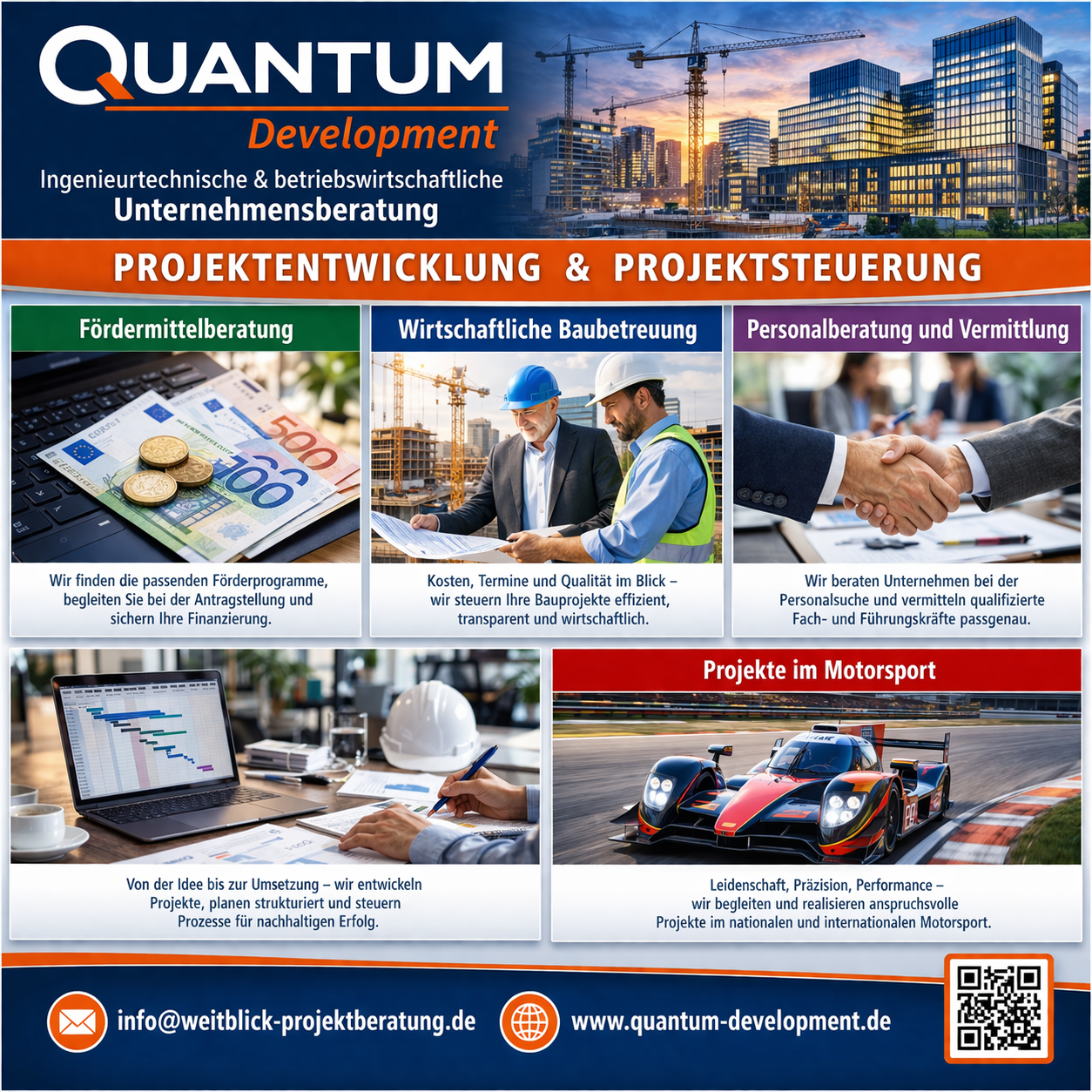 Quantum Development Consulting ist ein etabliertes Ingenieurbüro und Beratungsunternehmen mit umfangreicher Erfahrung in den Bereichen Projektentwicklung und Projektsteuerung. Wir bieten unseren Kunden maßgeschneiderte Lösungen, um ihre Projekte erfolgreich umzusetzen. Unser Team besteht aus hochqualifizierten Beratern mit verschiedenen Fachkenntnissen und einem breiten Erfahrungsschatz. Unser Ziel ist es, langfristige Partnerschaften aufzubauen und unsere Kunden in allen Phasen ihrer Projekte zu unterstützen.